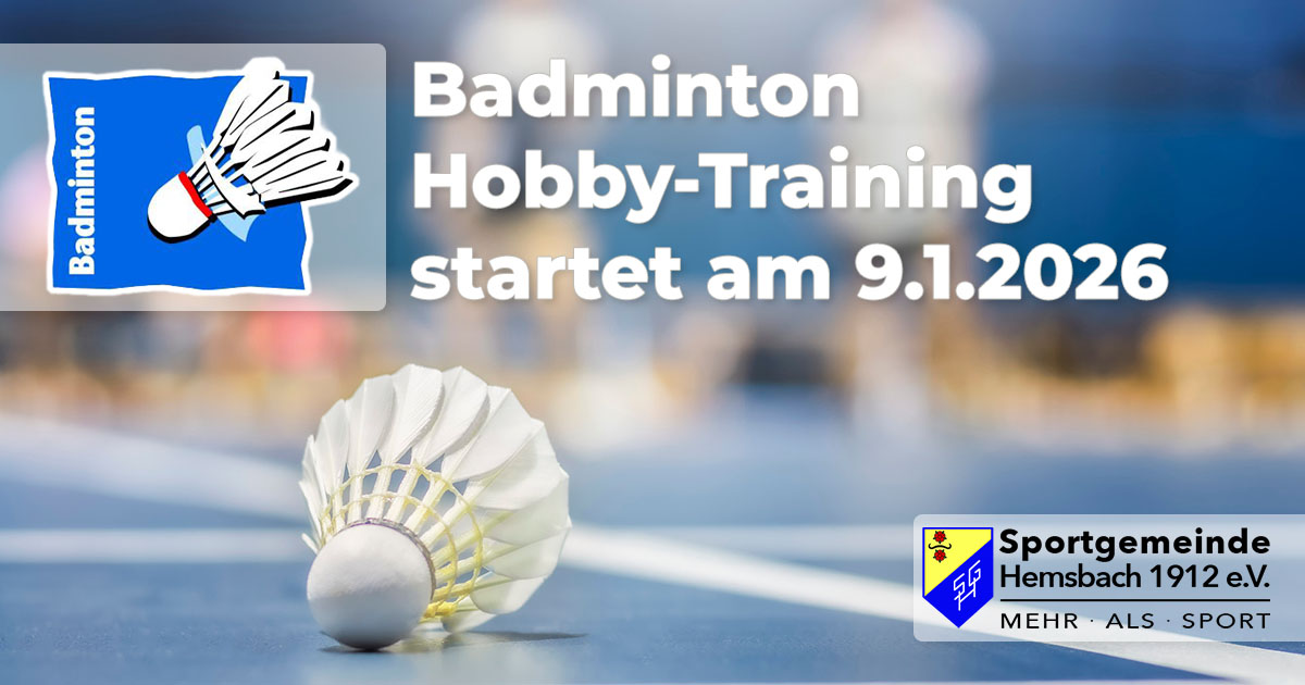 Am Freitag 9. Januar 2026 beginnt in der Spielhalle des Bildungszentrums Hemsbach wieder das Badmintonspieltraining der Hobbyspielerinnen und -spieler der SG Hemsbach. Von 19 bis 21 Uhr wird mit Schläger und Federball miteinander und gegeneinander gespielt. SportlerInnen unterschiedlichsten Alters und unterschiedlichster Leistungsstärke wollen vor allem Spaß beim Spiel mit dem Federball haben.
